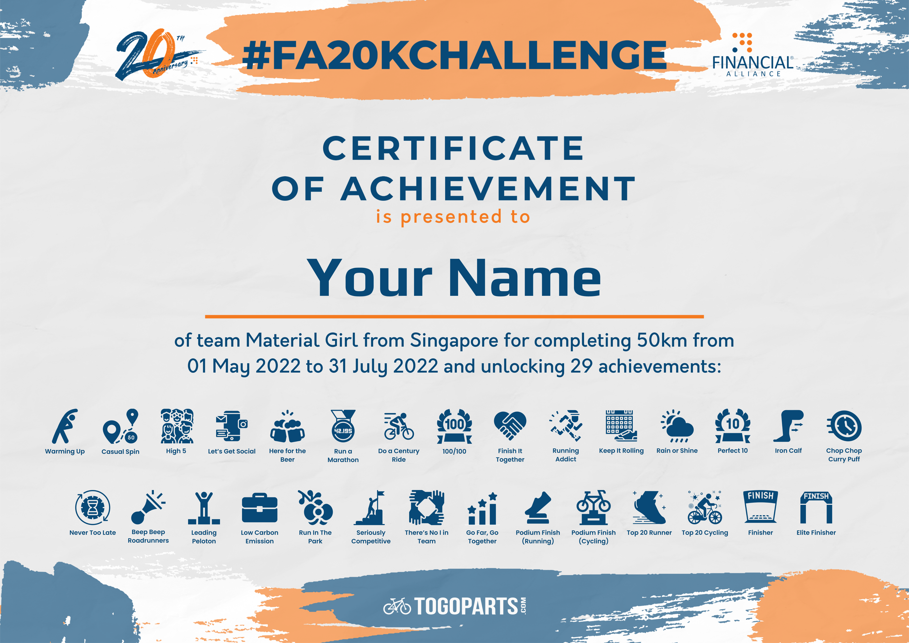 This year, Financial Alliance celebrates its 20th Anniversary. To promote an active and healthy lifestyle as well as bonding amongst the members of Financial Alliance Corporation, we will embark on a challenge to Run/Jog/Cycle 20,000km and raise S$20,000 towards Financial Alliance's 2022 CSR initiative in support of the #onemilliontrees movement.